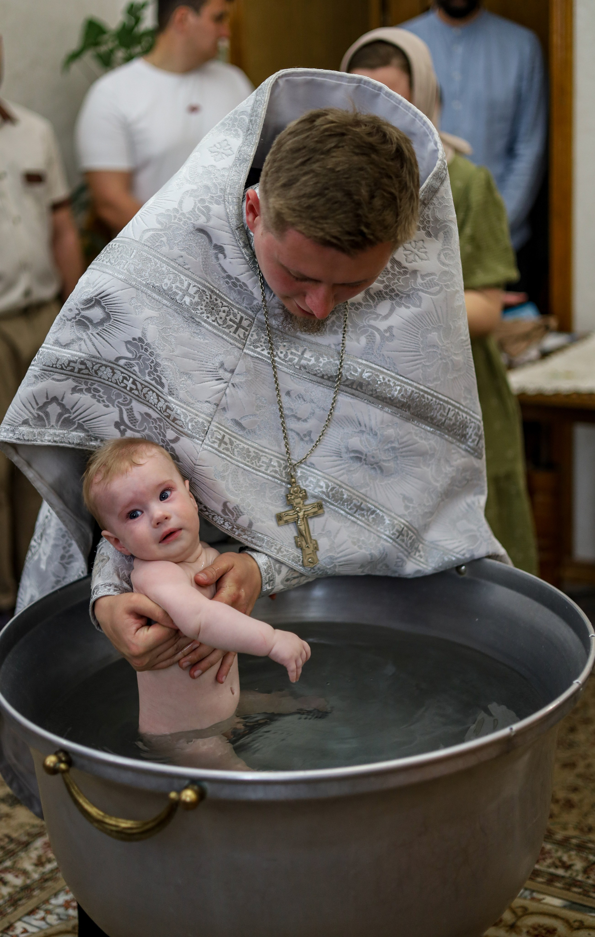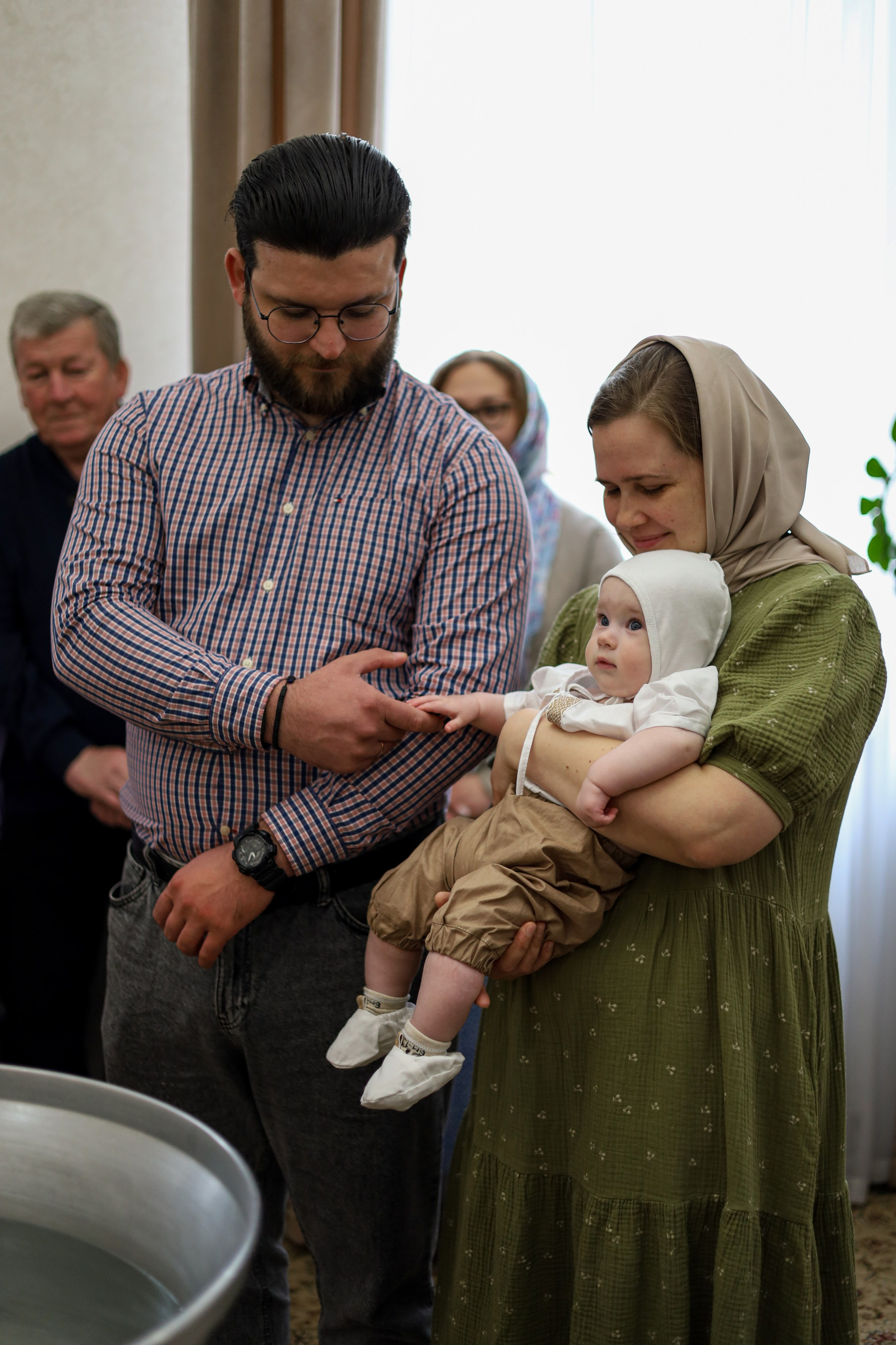 Трогательный момент крещения — родители с малышом в храме.